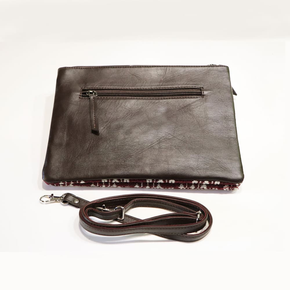 Handmade from rich burgundy print and metallic gold cotton jacquard fabric trimmed in genuine leather and fully lined interior.