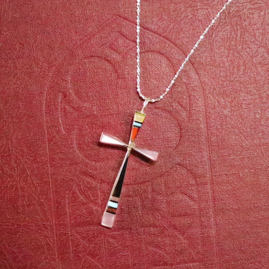 Sterling silver cross with squared ends and inlaid in traditional colors of shell, jet, turquoise, and jet.