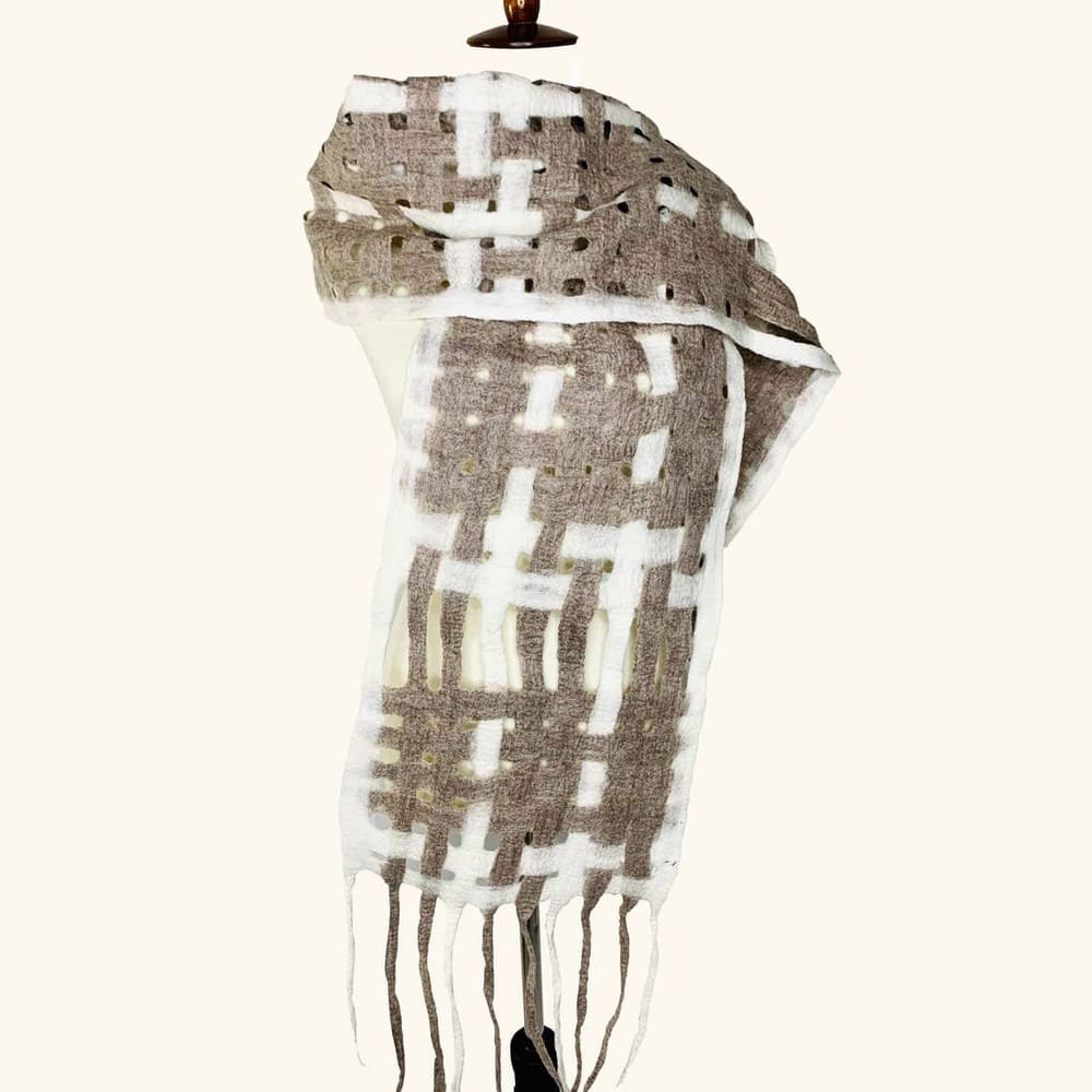 Beautiful basketweave in soft taupe and cream neutrals with long tassels on ends.